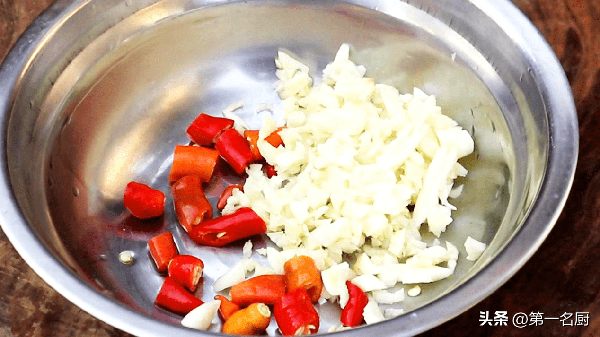 2,小米椒4个切成圈,大蒜一把逐个拍扁剁碎,和小米椒放在一起备用。