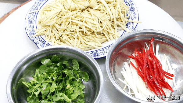1.准备豆腐皮三张,从中间划开,再从一边叠起来,用刀切成细丝,香菜几根切成段,大葱切成两段切成葱丝,红椒半个切成红椒丝备用。