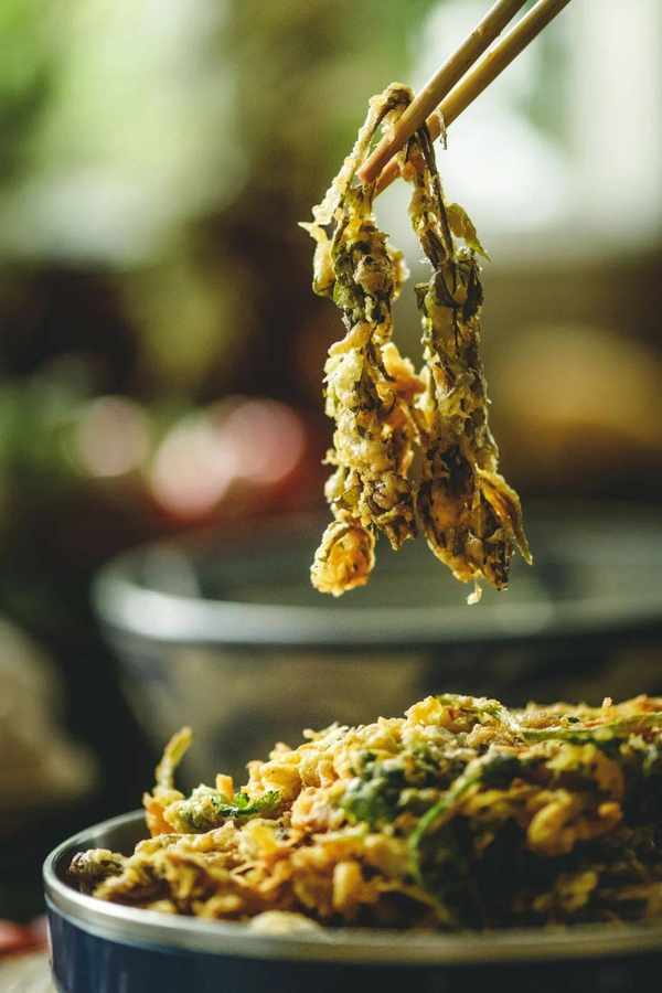 而对香椿芽更粗暴的烹调,则是按天妇罗的方式处理。将汆过水的椿芽裹上加蛋液调料的薄面浆,再下油锅烈火烹油的烹炸,这也是老北京所称道的“香椿鱼儿”。上过浆,又下过油锅的椿芽儿口感上外酥里嫩,试尝之下,则是一口脆鲜,满腹椿香。