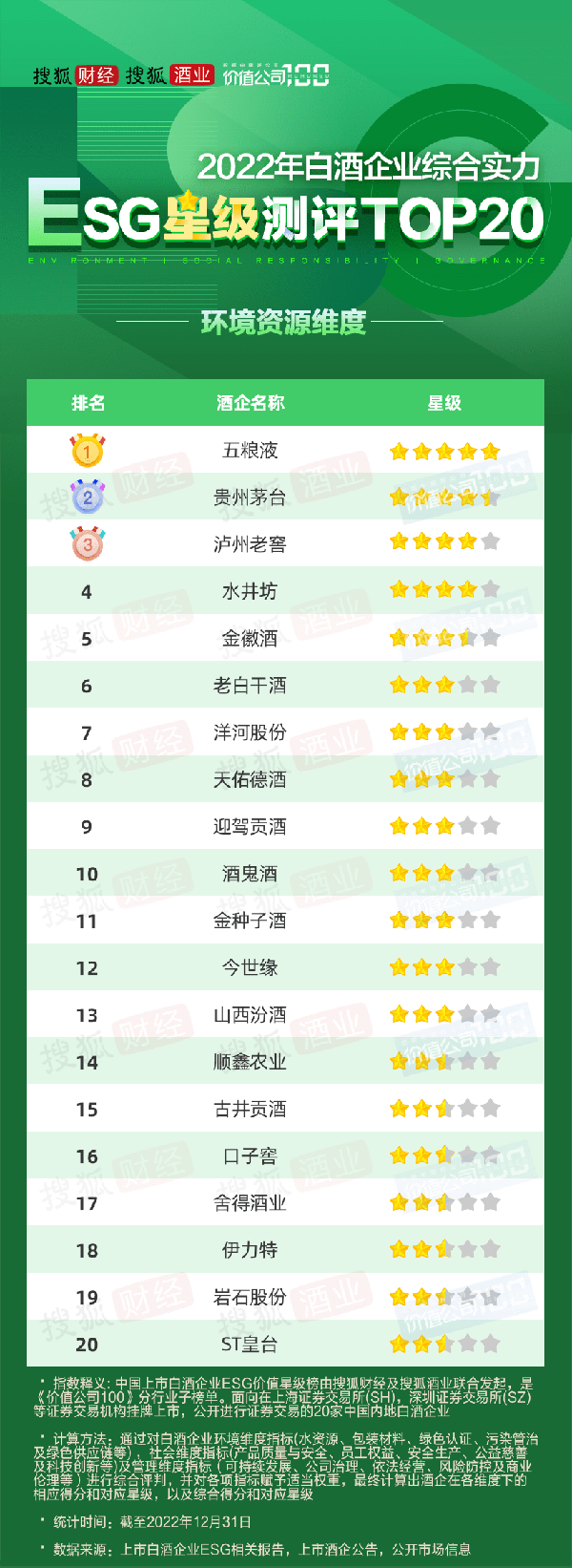 “中国上市白酒企业ESG星级榜”为价值公司100系列价值榜单下的分行业子榜单,由搜狐财经及搜狐酒业联合发起,通过对白酒企业环境维度指标(水资源、包装材料、绿色认证、污染管治及绿色供应链等) ,社会维度指标(产品质量与安全、员工权益、安全生产、公益慈善及科技创新等)及管理维度指标(可持续发展、公司治理、依法经营、风险防控及商业伦理等)进行综合评判,并对各项指标赋予适当权重,最终计算出酒企在各维度下的相应得分和对应星级,以及ESG综合实力得分和对应星级。