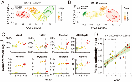 2、白酒年份越老含有的化合物种类越多,随陈酿时间的增加,己酸乙酯等量大的化合物含量略有降低,丙酸乙酯、吡嗪、萜烯等量小的化合物含量逐渐增加,酒体中各类化合物的含量差距略有缩小,进行化学计量学分析后发现,风味物质结构的均匀度指数随着陈酿时间的延长而增加,均匀度指数越高,说明白酒的化合物组成越均匀,这在一定程度上为陈酿白酒的风味更协调提供了解释。
