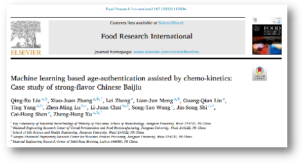 引用格式:Liu, Q.-R., Zhang, X.-J., Zheng, L., Meng, L.-J., Liu, G.-Q., Yang, T., Lu, Z.-M., Chai, L.-J., Wang, S.-T., Shi, J.-S., Shen, C.-H., Xu, Z.-H. (2023). Machine learning based age-authentication assisted by chemo-kinetics: Case study of strong-flavor Chinese Baijiu.[J] Food Research International, 112594.