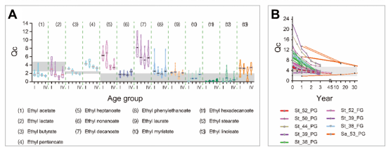 1、随着陈酿时间的增加,白酒中酸和长链乙酯的含量增加,它们通常能够使得白酒的香气和口感更柔和醇厚,此外,具有烘焙香、坚果香等愉悦香气的吡嗪和呈现松木香气的长叶烯在陈酿过程中也增加,这能够为陈酿白酒提供陈香等良好风味。结合感官审评发现,随陈酿时间的增加,酒体中的窖香、陈香、坚果香、酸香显著增加,而青香特征降低。