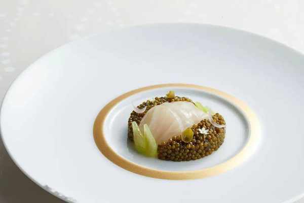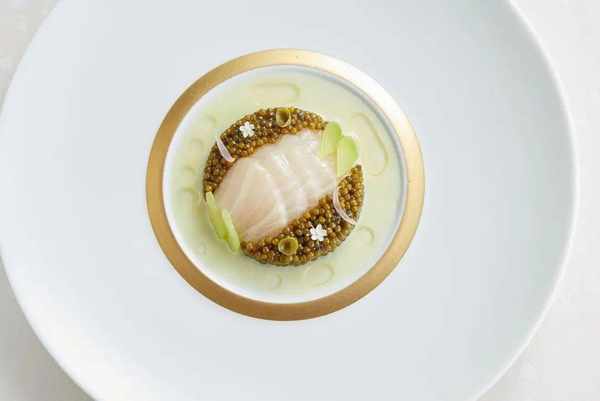 Ugo 在酱汁的部分做了微调,去除原有配方中过于浓郁的洋葱、大蒜,以生姜和香茅取代,还额外加了蔬菜汤,清新的辛辣感与鱼肉、鱼子酱和而不冲,这也是 Ugo 的菜品哲学之一:用轻盈的方式表现传统。