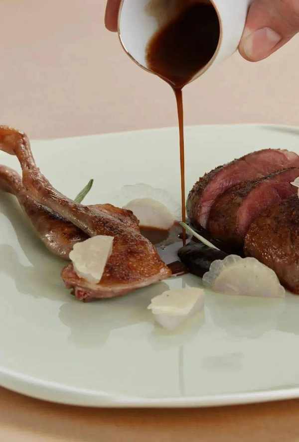 Ugo 为鸽肉搭配了鸽子汁和西梅酱。鸽子汁特地选了老鸽来制作,味道会更加浓郁;其中的西梅酱,用的是来自新疆的西梅,酸甜的味道和肉类的脂香搭配起来,无可挑剔。