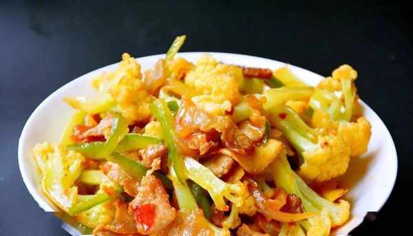 食材:菜花、里脊肉、小米辣、蒜瓣、生姜、白砂糖、生抽、蚝油、食盐