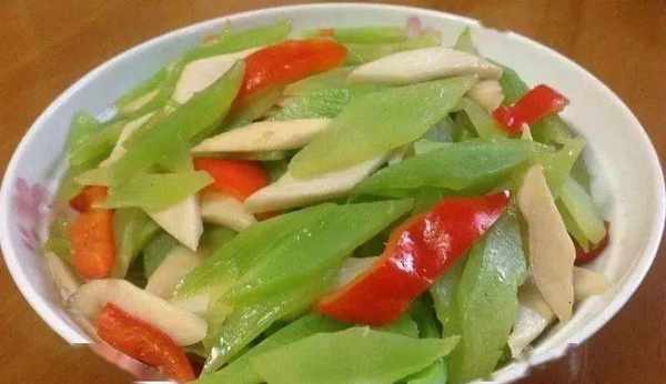 (5)再放入莴苣翻炒片刻,再放入青红椒翻炒至断生,再倒入调好的料汁调味。