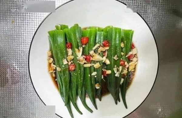 2、烧一锅开水,放入适量食盐、食用油,放入秋葵煮1分钟,熟透后捞出过凉水,沥干水分。起锅烧油,放入蒜末、干辣椒炸香,倒入调好的料汁煮开,浇在秋葵上即可。
