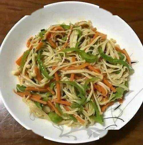 食材:金针菇、胡萝卜、青椒、生姜、大蒜、盐、生抽、醋