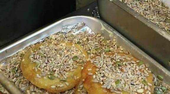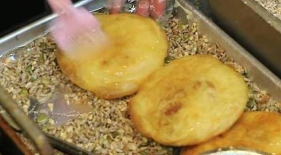 为了防止煎的过程焦糊,女同事将火候把握的非常到位,中途还不断用夹子翻动,等到烙饼煎得两面金黄之后,将其从锅中捞起来放在一个大盘中,然后用刷子蘸取自己秘制的蜂蜜酱,均匀地刷在上面,最后撒上瓜子仁,因为蜂蜜酱的粘性比较强,所以撒上瓜子仁粘的很紧,这样一道小吃就做成了。