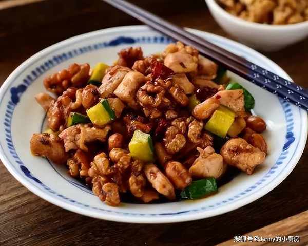 最后倒入鸡丁、核桃仁,放入盐、蚝油快炒几下,这道菜就做好了。