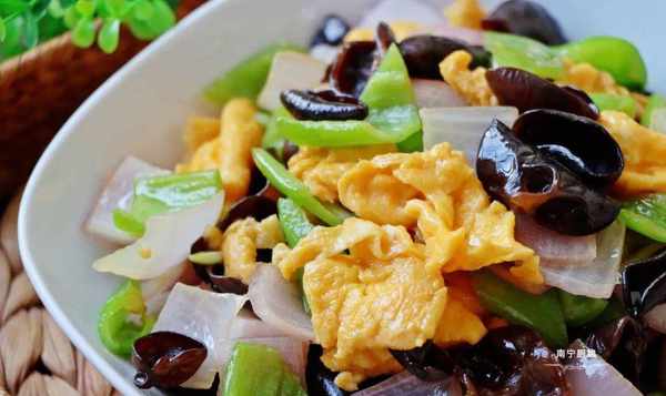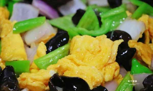 准备材料:干香菇10克、青椒2个、鸡蛋2个、洋葱1个、