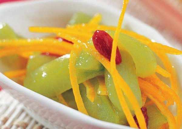 材料:丝瓜500克,柠檬皮50克,枸杞子少许,精盐1小匙,白糖1/2小匙。