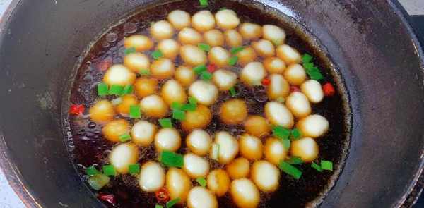 【芋头小丸子】制作材料有:芋头、土豆粒、小麦粉、胡椒粉、香油、大蒜、辣小米。