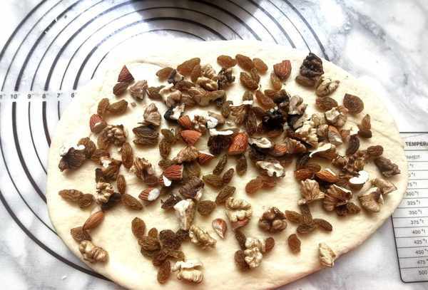 原料:高筋面粉600克,牛奶350克,蜂蜜1勺,盐3克,酵母3克,鸡蛋1个。原料:核桃、杏仁、葡萄干。