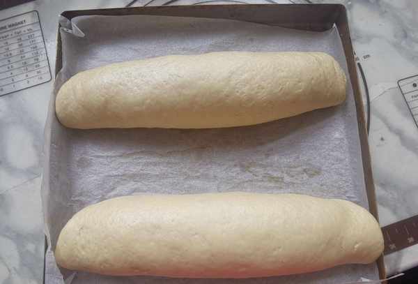 第五步:擀好后放在烤盘上二次发酵,让面包保持松软。如果喜欢吃硬一点的达力巴,可以用全麦面粉做。