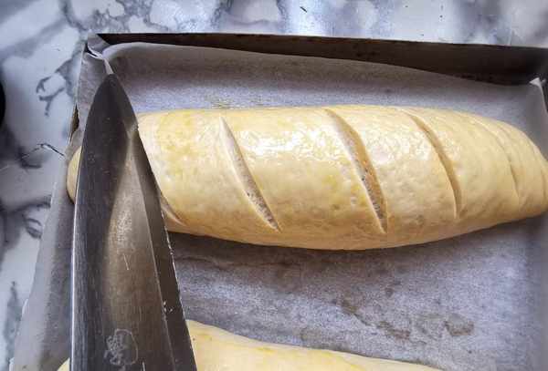 第七步:在发酵好的面包上刷上打好的蛋液,用刀在表面刮几下。