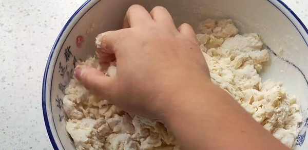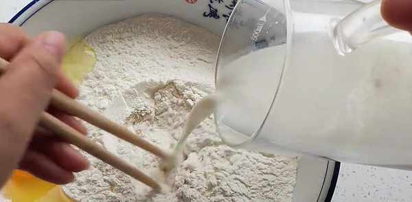 碗中放入1500克面粉,打2个鸡蛋,5克酵母,加40克糖。用温牛奶揉面团,边倒边搅拌。