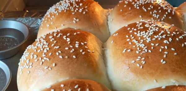 14.发酵完成后,在上面抹一层蛋黄液,撒上一些白芝麻,然后在锅里放一小碗热水。这样做的目的是防止表面在烘烤过程中变干。