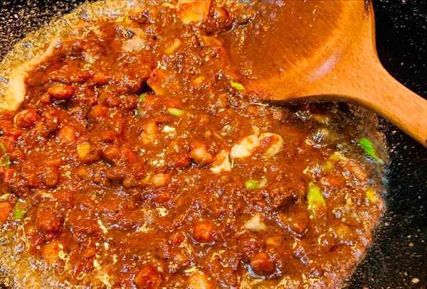 5.各阶段都要用小火煮,这样才不会粘底。拌匀。监控烹饪过程十分钟。酱汁会继续冒泡。出锅后分几坛盛入,闻香即熄火盛入碗中。
