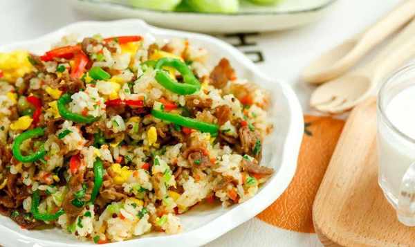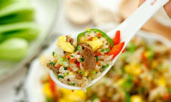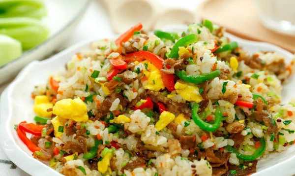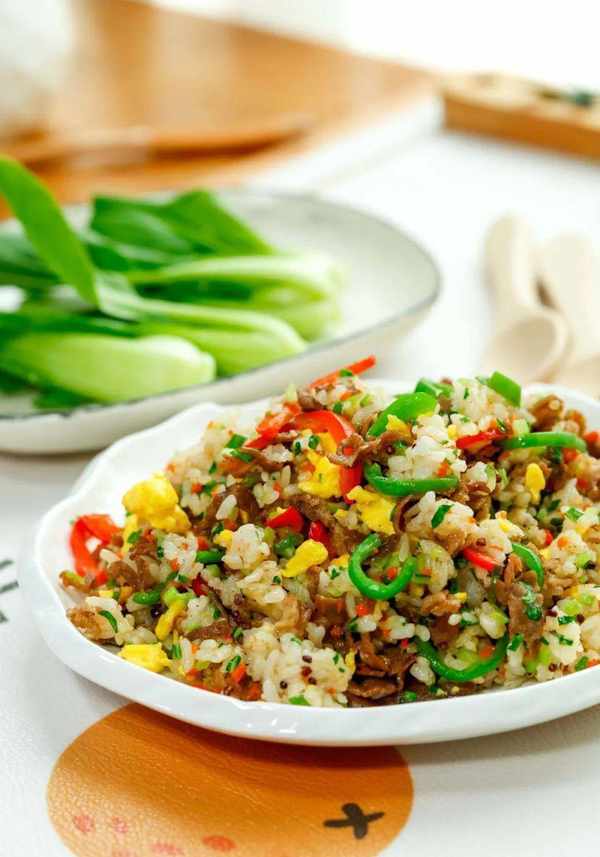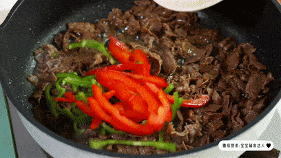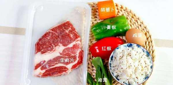 青椒30克/红椒30克/鸡蛋1个/牛肉片