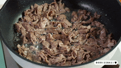 将油倒入不燃烧的锅中,加入牛肉片,炒至肉变色和调味。