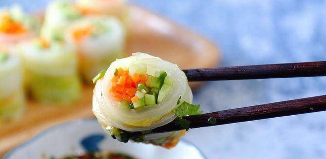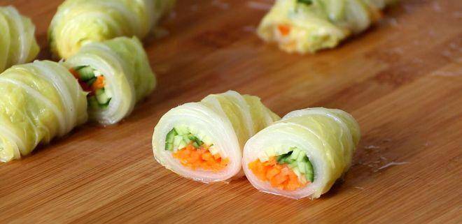 7。取一片焯过水的白菜,上面放一片胡萝卜和一片黄瓜,把白菜卷起来包紧;
