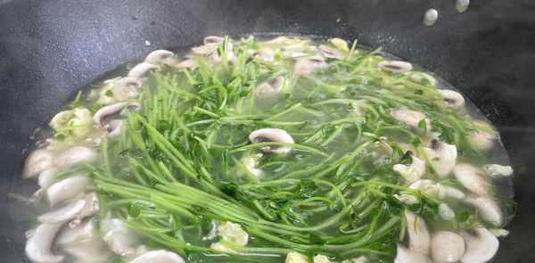 4。煮好后,将蘑菇和豌豆苗放入锅中,加盐调味;