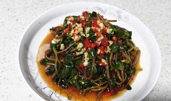 4。将马齿苋摆盘,将调好的酱汁淋在蔬菜上,拌匀即可食用。