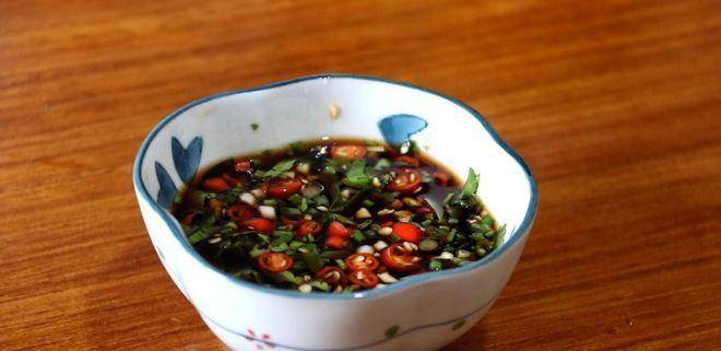 3。准备一些材料,将大蒜和小米切碎放入盛满热油的碗中,倒入少许酱油、盐和糖,根据自己喜欢的口味拌匀;