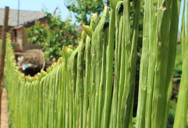 或者如果没有太阳,可以先用盐杀水。用盐脱水过的生菜,脱水后要用清水洗净,去除多余的盐分。然后将其悬挂晾干或晾干衬里。