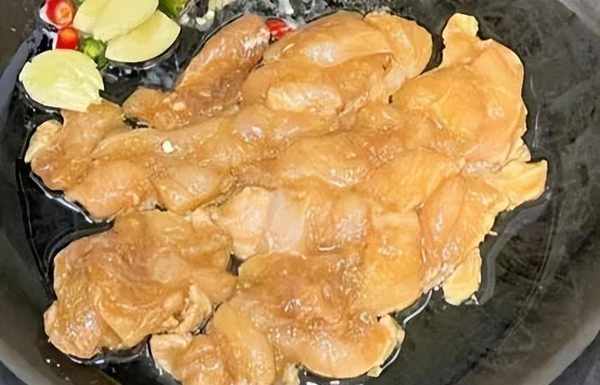 第三步,锅中加入基础油。加热至40%时,加入大蒜和小米炒香,然后加入鸡胸肉,边小火边慢慢翻炒。