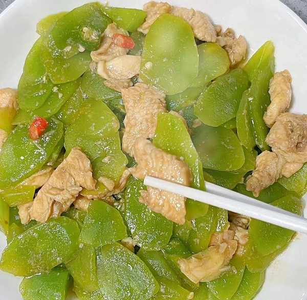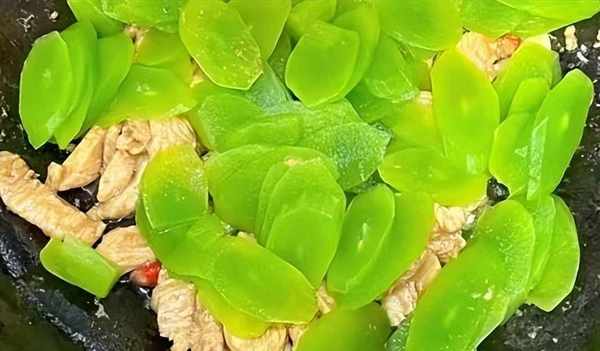 第四步,加入生菜片,用中火翻炒,直到它们散开。
