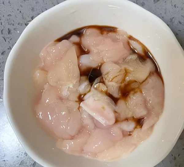 第二步,将鸡胸肉放入碗中,加入少许生抽、花椒面、水和淀粉,拌匀腌制10分钟。