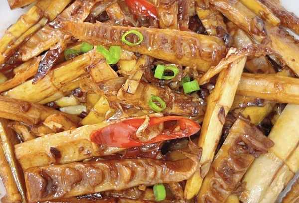 1、春笋去皮,切成薄片,放入冷锅中焯水15分钟,捞出,洗净沥干备用。