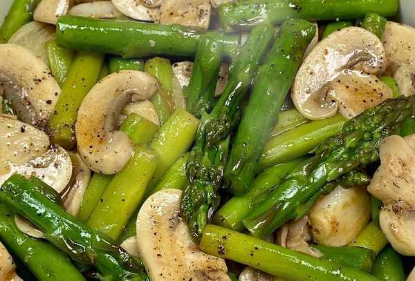 3、炒至香菇变软,再加入芦笋炒匀,再加入适量的盐、酱油、蚝油、黑胡椒调味,继续炒至入味,即可出锅食用平底锅的。