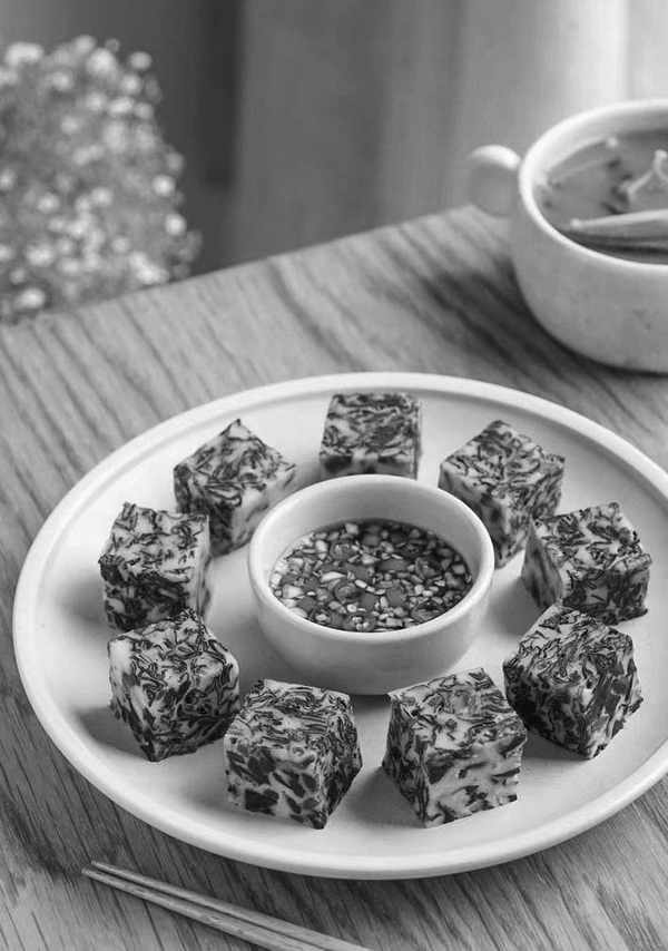 4、另取一个平底碗,刷上食用油,倒入蛋液,盖上保鲜膜,用牙签戳几个洞。锅中水烧开后,中火煮20分钟,再煮10分钟。稍微冷却后,换刀,切成3×3厘米的方块。