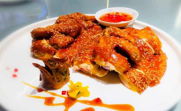 3、将鸡肉放入烤箱170度烤28分钟左右,然后倒入油上色至表皮呈褐色,然后切块淋上泰式鸡汁。