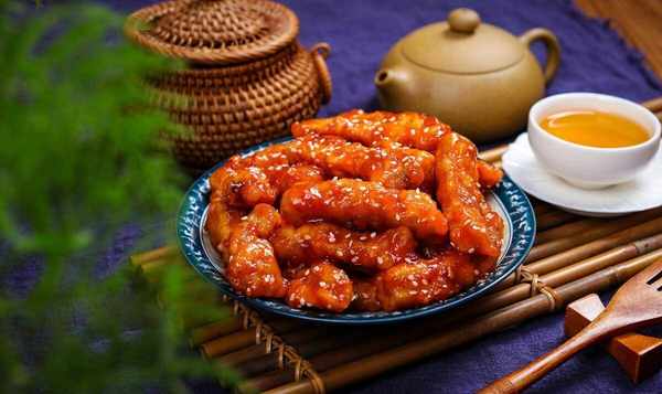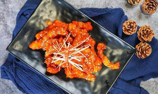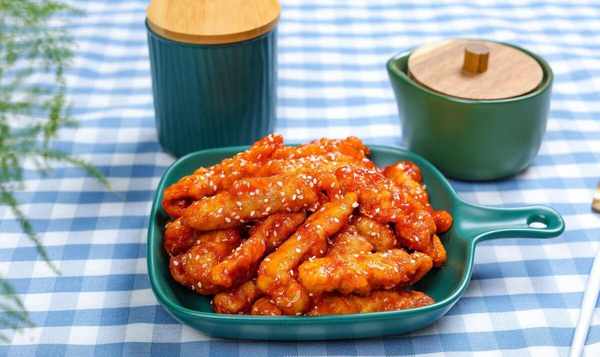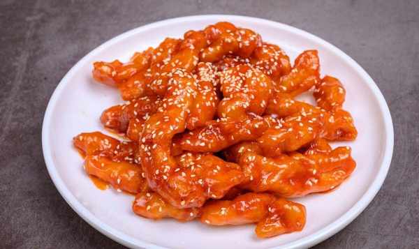 平底锅烧热油,油温70%,放入切好的里脊肉炸至金黄,用火柴沾肉,肉发出滋滋声,即可出锅。锅底留少许油,加入调好的酱汁,煮至浓稠,将里脊肉翻炒均匀,出锅前加少许熟芝麻。