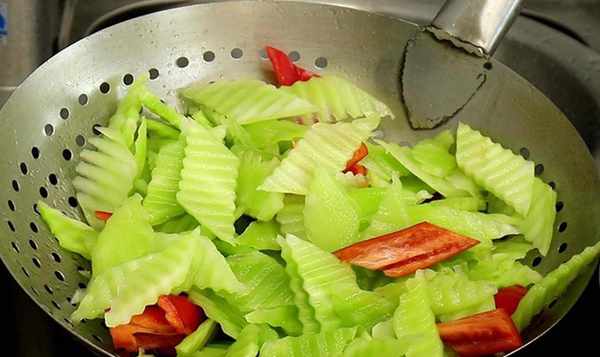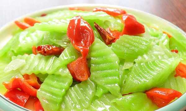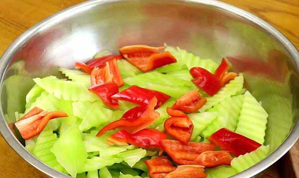 1.生菜两颗,剥去外皮和粗纤维,切成均匀的菱形薄片;然后切一些红辣椒片以匹配颜色。