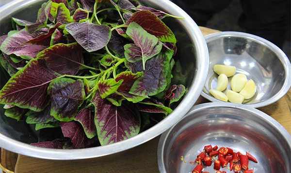1.红苋菜一把,去根压碎,用淡盐水浸泡,加少许小米椒,切辣椒圈;将大蒜放入蒜泥中,放入蒜泥中待用。