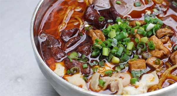 其三是肠旺面,肠旺面也是贵州的一道特色美食,它的主要原料是猪大肠、新鲜的猪血旺和擀制的鸡蛋面条。蓝领生活认为肠旺面讲究的是色、香、味,色一定是红,红色猪血、红色的辣油;香,那就是脆臊的香、辣油的香还有猪大肠的香;红而不辣、油而不腻。
