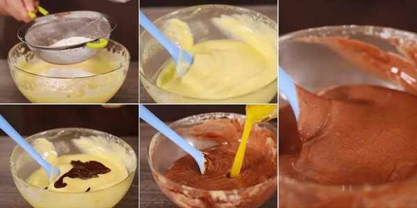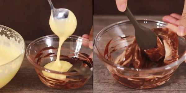 先盛一勺打发的蛋液到可可糊里,用刮刀充分拌匀。