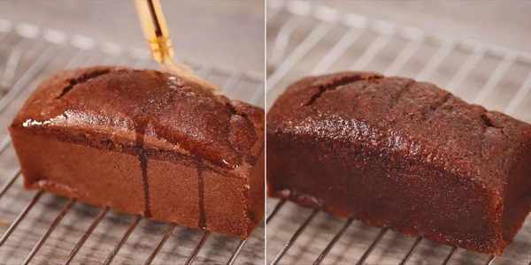 用毛刷蘸糖浆刷在蛋糕上。要每一面都刷均匀,尽量让蛋糕吸饱糖浆。然后将蛋糕密封冷藏过夜。一定要冷藏过夜,让蛋糕内部有充足的时间吸收糖浆。