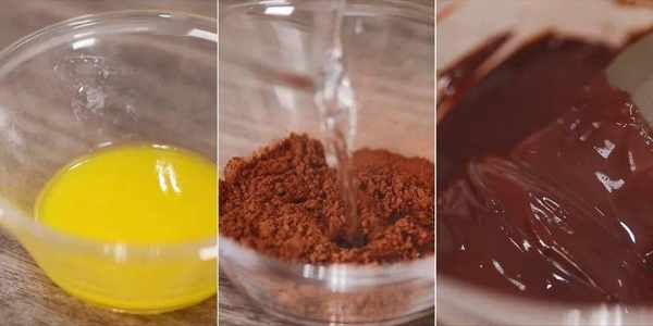 第二个准备步骤是在可可粉里倒入开水,并快速搅拌,成为浓稠的可可糊备用。