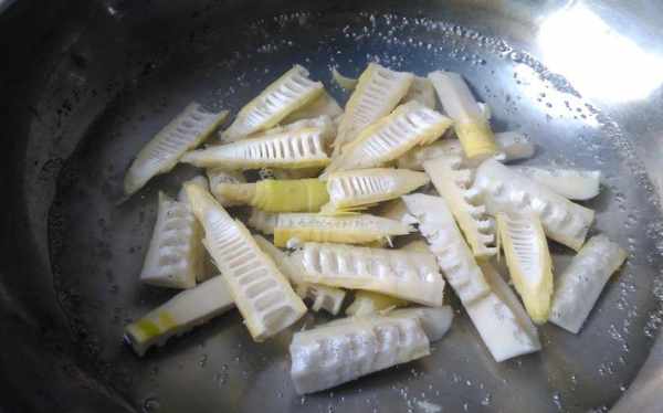 2、锅中加清水,水开后把切好的春笋放进去焯3分钟捞出过凉沥干水分。另起一个炒锅,锅中倒入食用油,油热后放几根葱白进去提香,然后将春笋倒进去翻炒2分钟。