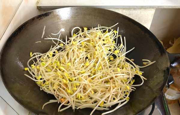 3、豆芽炒至断生后,下青蒜苗二者混合继续煸炒30秒,出锅前沿着锅边放两勺醋、1勺生抽、1勺盐、1勺白糖以及适量鸡精,翻炒几下就可以盛出食用了。