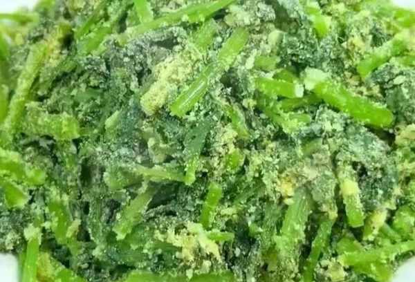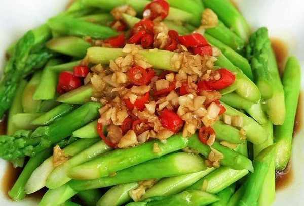1、芦笋剥去老皮,洗净切小块。苦小米切成圈,大蒜切成蒜末。