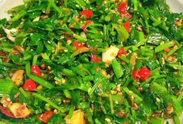 3.将凉拌酱汁浇在香菜上,拌匀即可食用。