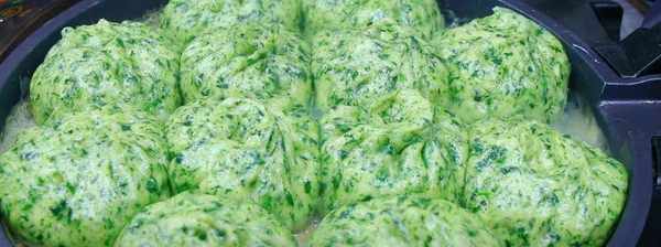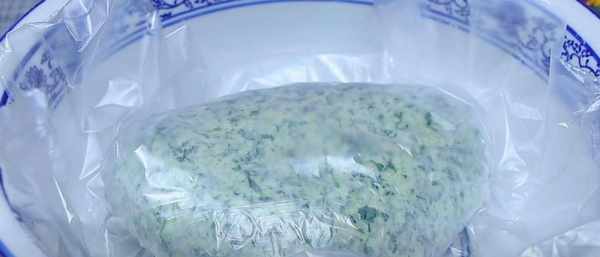 Step2.冷却后的菠菜切碎,连根切碎备用。切碎一些菠菜叶,放入碗中,加入2克小苏打和2克干酵母,搅拌至融化。